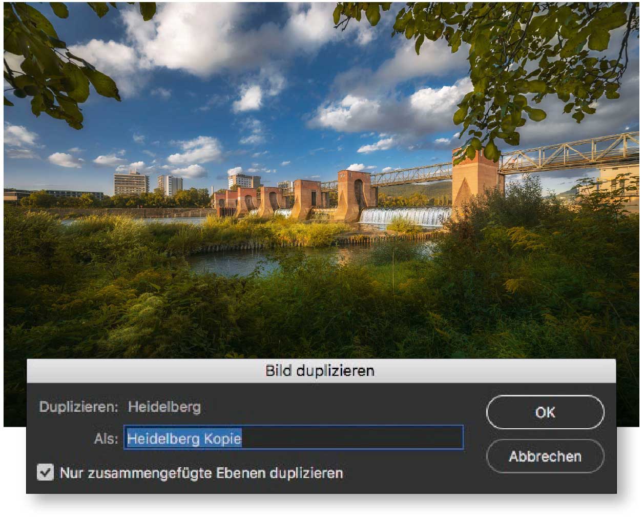 Gerade nachdem Sie ein Foto aufwendig bearbeitet haben, wäre es natürlich ärgerlich, wenn Sie in einem Moment der Unachtsamkeit das Originalfoto auf eine Ebene reduzieren, verkleinern und dann speichern würden. Erzeugen Sie deshalb vor jedem Verkleinern zunächst eine Kopie Ihres Bildes und fassen Sie dann erst die Ebenen auf die Hintergrundebene zusammen. Das können Sie bei geöffneter Datei in einem Schritt mit »Bild > Duplizieren« erledigen. Aktivieren Sie dort die etwas sperrig benannte Checkbox »Nur zusammengefügte Ebenen duplizieren« und vergeben Sie den gewünschten Dateinamen.