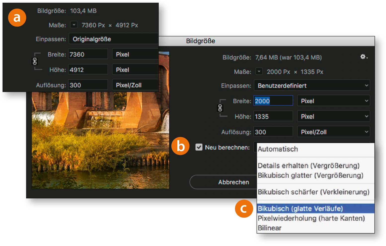 Das Originalfoto ist mit seinen rund 7300 × 5000 Pixeln (a) viel zu groß für das Internet und muss zunächst verkleinert werden. Während vor langer Zeit eine gängige Ausgabegröße noch bei 800 × 600 Pixeln lag, reichen Bildgrößen unter 1000 Pixeln Seitenlänge kaum noch aus, um Sie an hochauflösenden Monitoren in vernünftiger Größe und Qualität betrachten zu können. Mit einer Seitenlänge von um die 2000 Pixel sind Sie hier auf der sicheren Seite. Wählen Sie für das beste Skalierungsergebnis unter »Neu berechnen« (b) die Option »Bikubisch (glatte Verläufe)« (c).
