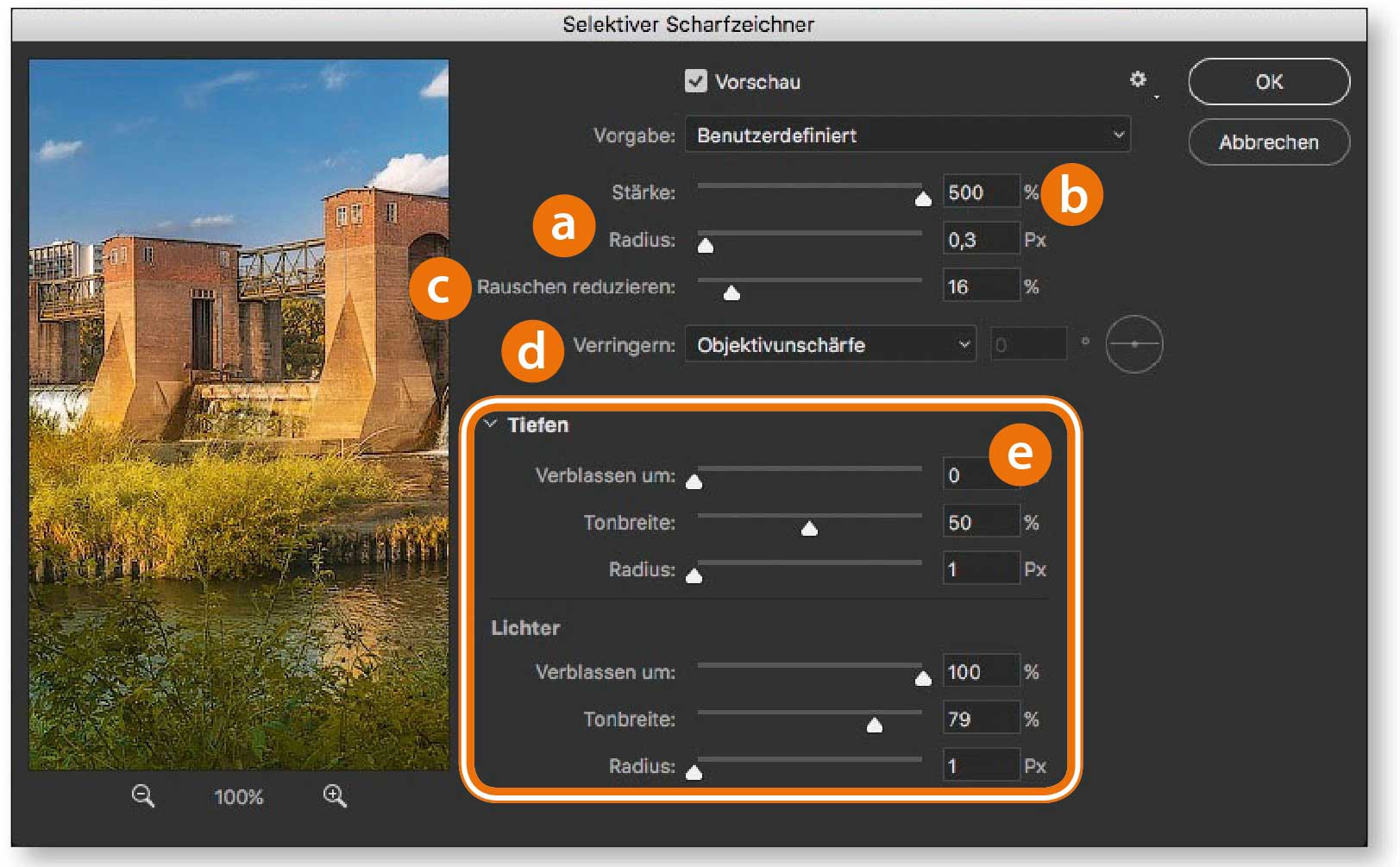 Durch das Verkleinern wirkt das Bild leicht unscharf. Das gleichen Sie durch Nachschärfen aus. Stellen Sie über »Ansicht > 100%« das Bild in der Eins-zu-Eins-Ansicht dar (ein Bildpixel entspricht einem Monitorpixel) und wählen Sie »Filter > Scharfzeichnungsfilter > Selektiver Scharfzeichner«. Der wichtigste Aspekt ist hierbei, dass Sie mit einem »Radius« (a) von unter einem Pixel arbeiten. In der Regel ist hier ein Wert von 0,2 bis 0,3 empfehlenswert. Achten Sie auf die Filtervorschau und erhöhen Sie die »Stärke« (b). Aufgrund des kleinen Radius können Sie mit ziemlich hohen Werten von 200 bis 500 % arbeiten. Mit »Rauschen reduzieren« (c) glätten Sie Flächen, falls störendes Rauschen zutage tritt. Bei »Verringern« (d) wählen Sie die Option »Objektivunschärfe«, die eine etwas feinere Detailschärfung bewirkt als die dort ebenfalls zu findende Option »Gaußscher Weichzeichner«. Im unteren Bereich des Dialogs (e) legen Sie fest, wie kräftig die Schärfung die Tiefen beziehungsweise die Lichter betreffen soll. Falls Sie helle Säume im Bild sehen, reduzieren Sie diese wie abgebildet mit einem hohen Wert für »Verblassen um« unter »Lichter«.