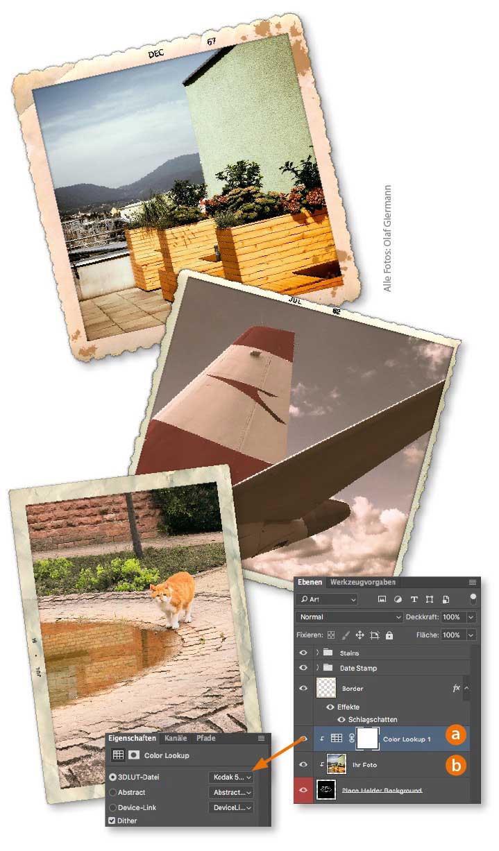 Eine Reihe gescannter Foto- und Bildränder aus den sechziger Jahren finden Sie unter www.docma.info/20145. Die PSD-Dateien erleichtern das Einsetzen Ihrer eigenen Fotos. Statt wie vom Ersteller der Vorlagen beschrieben die unterste, rot markierte Ebene auszublenden, platzieren Sie einfach Ihr eigenes Bild direkt darüber und erzeugen Sie eine Schnittmaske, indem Sie mit gehaltener »Alt«-Taste zwischen die Ebenen klicken (b). Auf diese Weise wird Ihr Bild wirklich nur innerhalb des Rahmens angezeigt. Transformieren Sie das platzierte Bild auf die gewünschte Größe. Nutzen Sie Einstellungsebenen, um Ihrem Digitalfoto eine ältere Anmutung zu geben. Empfehlenswert sind hier die im Lieferumfang von Photoshop CC enthaltenen »Color Lookup«-Vorgaben, die mit „Fuji“ oder „Kodak“ beginnen (a). Speichern Sie Ihre Fotovarianten anschließend mit »Datei > Exportieren > Für Web speichern (Legacy)« im PNG-Format mit aktivierter Checkbox »Transparenz«, falls Sie den transparenten Hintergrund bewahren möchten.