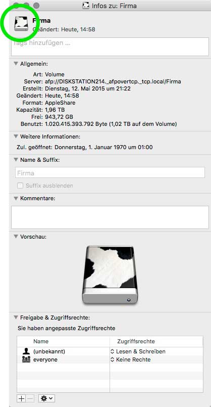 In wenigen Schritten lässt sich das alte Symbol dann gegen ein neues austauschen. Klicken Sie dazu mit der rechten Maustaste auf das Laufwerkssymbol im Finder und wählen Sie »Informationen«. In der Informationen-Palette sehen Sie das aktuelle Icon im unteren Bereich groß und in der oberen linken Ecke noch einmal klein abgebildet. Ziehen Sie nun die png-Datei mit dem neuen Icon direkt auf das kleine Icon links oben und lassen Sie die Maustaste los. Nun sollten sich beide Bildchen im Informationen-Fenster dem neuen Symbol entsprechend ändern. Falls Sie statt dessen nur eine leere png-Platzhaltergrafik sehen, ist ein Workaround erforderlich.