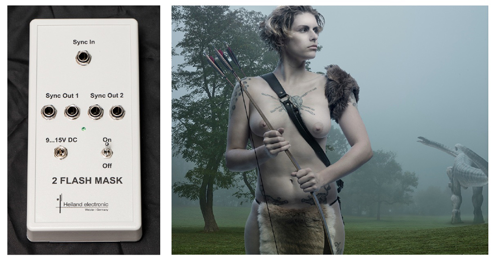 „2 Flash Mask“ ist eine spezielle Blitzweiche, die ich für diese Anwendung entwickelt habe. Die Kamera, die sich im Modus „High speed – Multi Shot“ befindet, schließen Sie an „Sync In“ an. Die Blitzweiche hat vier Ausgänge, von denen je zwei parallel geschaltet sind. Mit 6,3-mm-Klinkenkabeln können Sie darüber bis zu vier Blitzgeräte oder Generatoren, über Funkauslöser auch Speedlights auslösen. Bei der ersten Kameraauslösung werden die Blitze an „Sync Out 1“ gezündet, bei der zweiten Auslösung diejenigen an „Sync Out 2“. Nachdem Sie so Modell und Maske fotografiert haben, sind nur noch wenige Bildbearbeitungsschritte nötig.