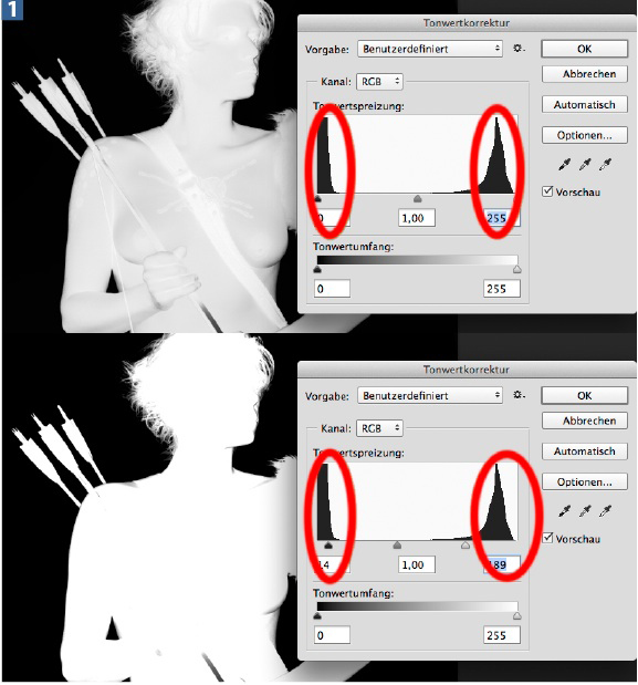 Nach dem Import in Photoshop wandeln Sie das Maskenbild mit »Bild > Modus > Graustufen« um und invertieren es für den gewünschten Maskierungseffekt mit »Bild > Korrekturen > Umkehren«. Sie können die Freistellung noch mit einer Tonwertkorrektur verbessern, indem Sie die im Histogramm deutlich sichtbaren Bereiche des Hintergrundes und der Silhouette im Kontrast erhöhen.