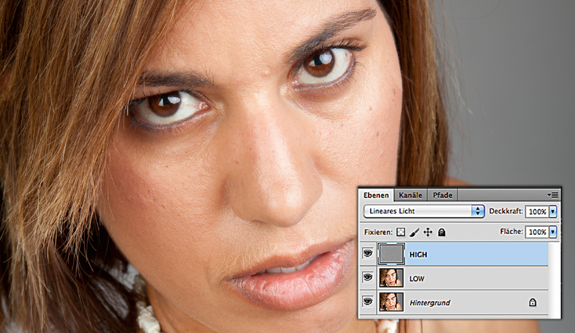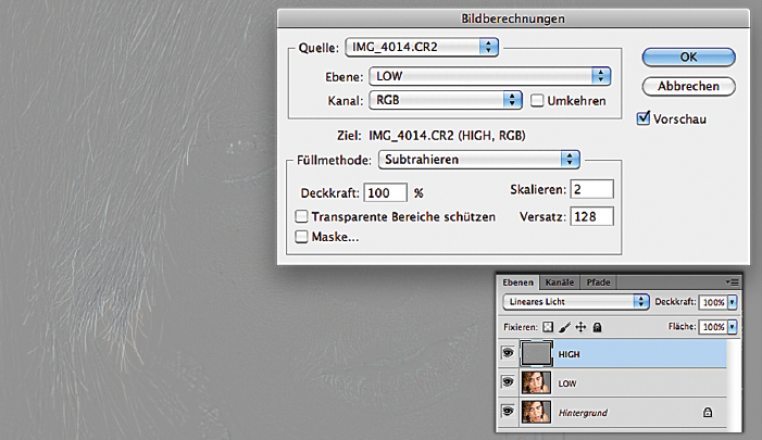 Um die Details getrennt von der Farbigkeit herauszuarbeiten, nutzen Sie die „Bildberechnungen“ aus dem Menü „Bild“. Nehmen Sie je nach Bittiefe des Bildes folgende Einstellungen vor: 8-Bit Bild: Ebene LOW; Kanal RGB; Füllmethode Subtrahieren; Skalieren 2 und Versatz 128; Quellebene nicht invertieren. 16-Bit Bild: Füllmethode Addieren; Skalieren 2; Versatz 0, Quellebene invertieren. Danach wird die HIGH-Ebene (die jetzt einer Hochpass-Ebene ähnlich sieht) auf Ebenenmodus „Lineares Licht“ gesetzt. Durch diese Verrechnung der zwei Ebenen erscheint das Bild wieder wie im Original. Jetzt kann die Retusche erfolgen.