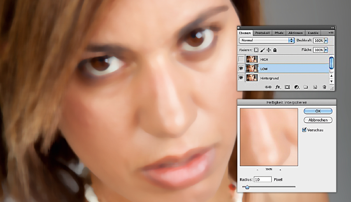 Erstellen Sie zwei Ebenenkopien. Die untere Ebene nennen Sie LOW, die obere HIGH. Die HIGH-Ebene blenden Sie aus, die Ebene LOW aktivieren Sie. Die LOW-Ebene wird nun weichgezeichnet, damit sie keine Details mehr enthält. Das erreichen Sie, indem Sie zum Beispiel „Rauschfilter?>?Helligkeit interpolieren“ mit circa 10 Pixeln anwenden. Nun blenden Sie die HIGH-Ebene wieder ein und aktivieren sie. Der nächste Schritt beruht auf mathematischen Grundlagen und erfolgt über die Bildberechnungen.