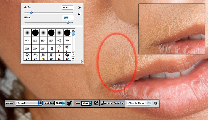 Die störenden Hautdetails retuschieren Sie auf der HIGH-Ebene mit dem Stempel-Werkzeug (ca. 90?% Härte). Bei „Aufnehmen“ muss „Aktuelle Ebene“ ausgewählt sein. Es können nur recht kleine Strukturen gestempelt werden, da nur diese in der HIGH-Ebene vorhanden sind. So lassen sich Pickelchen, einzelne Haare und dergleichen wegstempeln, ohne Stempelspuren zu hinterlassen, da nur die Struktur, nicht aber die Farbtöne der Haut betroffen sind. Auch einen schwer zu retuschierenden Damenbart kann man mit dieser Methode sehr leicht und sauber entfernen.