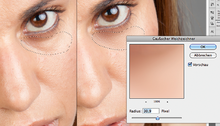 Wollen Sie die Farbe der Haut glätten, verwenden Sie die LOW-Ebene. Diese enthält die niederfrequenten Bildinformationen, das heißt die Tonwerte der Haut. Um zum Beispiel fleckige Haut in der Farbe anzupassen, wählen Sie den entsprechenden Bereich großzügig mit dem Auswahlwerkzeug aus, wobei eine weiche Auswahlkante von etwa 10 Pixel verwendet werden sollte. Diese Auswahl behandeln Sie dann beispielsweise mit dem Gaußschen Weichzeichner, wobei der Radius recht groß ausfallen (ca. 20-40 Pixel) kann.