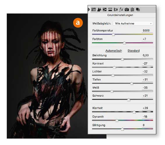 Bei der Entwicklung in »Camera Raw« verstärken Sie die Details und sorgen, wie im Screenshot gezeigt, für ein etwas flaueres und entsättigteres Bild (b).