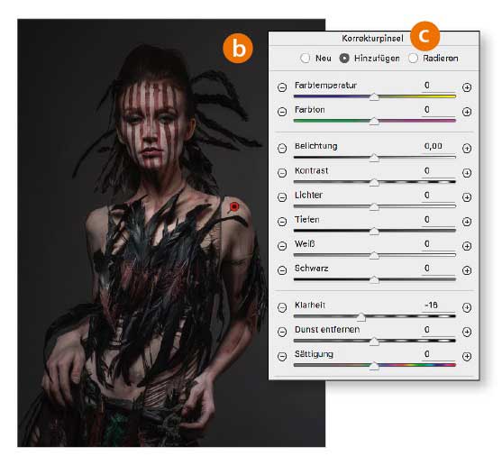 Eine subtile Hautbearbeitung erfolgt ebenfalls schon in »Camera Raw« durch das selektive Verringern der »Klarheit« mit dem »Korrekturpinsel« (c). Solche Werkzeug-Einstellungen können Sie über das Panel-Menü in »Camera Raw« auch als Vorgabe zur späteren Wiederverwendung abspeichern.