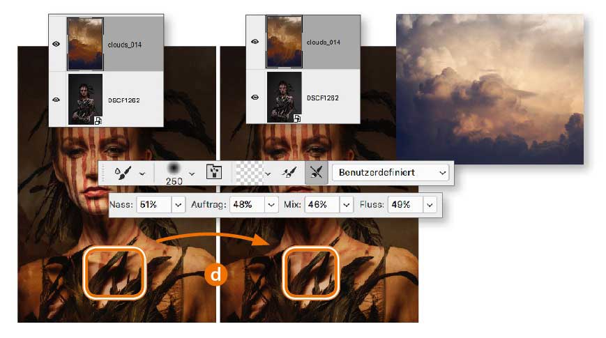Eine präzise Freistellung des Models ist für das Einmontieren des neuen Hintergrundes nicht erforderlich. Legen Sie eine passende, nicht zu detailreiche Textur als Ebene im Modus »Ineinanderkopieren« oder »Weiches Licht« über das Bild und verwischen Sie deren Details an den Stellen mit dem »Mischpinsel«, an denen vorhandene Kanten oder Strukturen zu auffällig in Erscheinung treten (d).