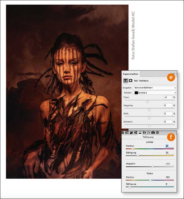 Einen geeigneten Farblook finden Sie entweder über die in DOCMA 75 auf Seite 26 beschriebene zufällige »Verlaufsumsetzung« oder Sie legen ihn gezielt mit einer Einstellungsebene vom Typ »Selektive Farbkorrektur« fest – hier mit einer leichten Verfremdung in den Schatten (e). Natürlich können Sie beide Techniken auch kombinieren. Fassen Sie zur finalen Optimierung das Bild wie auf Seite 27 beschrieben als Smartobjekt zusammen und wenden Sie den »Camera Raw-Filter« darauf an. Besonders gern nutze ich dann die »Teiltonung« zur Farbstilisierung (f) und optional den »Korrekturpinsel« zum Herausarbeiten heller oder dunkler Bildteile.