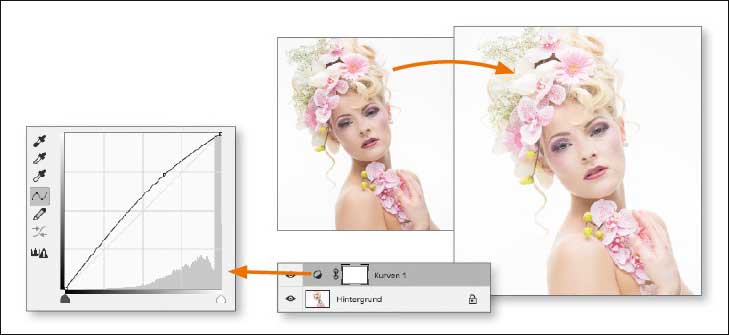 Legen Sie eine Einstellungsebene des Typs »Gradationskurven« an und ziehen Sie die Kurve leicht nach oben, um die Mitteltöne dezent aufzuhellen.