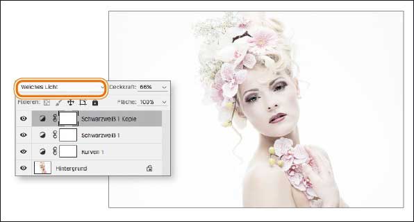 Duplizieren Sie die Einstellungsebene »Schwarzweiß« mit »Strg-J« und ändern Sie den Ebenenmodus in »Weiches Licht«. Reduzieren Sie die Deckkraft, bis der Kontrast Ihren Vorstellungen entspricht.