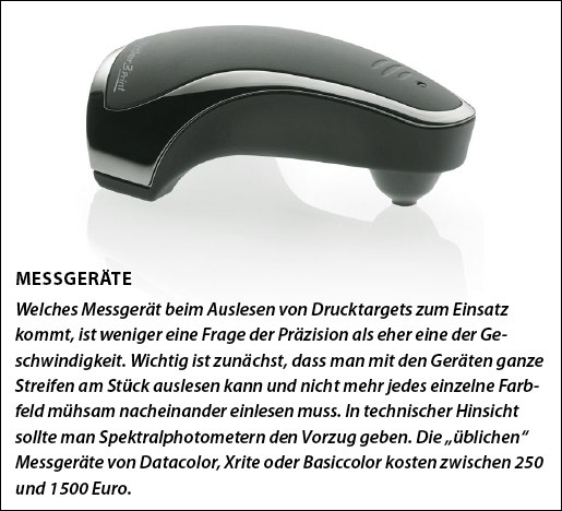 Wer präziser drucken will, misst seine eigenen Druck-Profile aus und versucht auf diesem Weg, Defizite der Treiber zu kompensieren. Messgeräte mit entsprechender Software gibt es schon ab rund 250 Euro. Die Komfort-Alternative besteht darin, das passende Papier zum Drucker zu verwenden und auf mitgelieferte Profile des Herstellers zurückzugreifen. Damit entstehen zumeist farblich halbwegs korrekte Drucke – aber leider keine sehr guten FineArt-Prints.