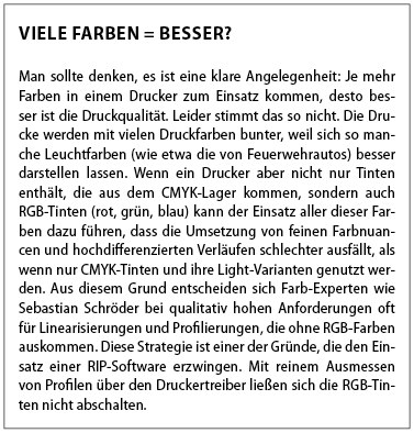Druckertreiber werden von den Drucker-Herstellern gemacht, und die müssen sich zwischen den Polen „anwenderfreundlich“ und „technisch machbar“ spreizen. Die Aufgabe des Treibers besteht darin, die RGB-Daten aus der Anwendung möglichst perfekt auf die im Drucker genutzten Tinten umzurechnen. „Im Grunde passiert hier also etwas ähnliches wie bei einer RGB-CMYK Umwandlung – also einer Separierung der Bildkanäle von Lichtfarbe nach Druckfarbe. Doch es gibt zwei wesentliche Unterschiede: Erstens sind die Tinten nicht wie etwa die Druckfarben im Offsetdruck normiert, sondern jeder Hersteller kocht seine eigenen Farb-Süppchen. Zweitens gibt es Modelle mit bis zu 12 unterschiedlichen Farben, was eine sehr individuelle Umsetzung nötig macht. Die klassische Offset-Vierfarbseparation wurde über Jahre entwickelt, bis sie den heutigen Standard erreichte, Druckertreiber entstehen vergleichsweise eher zwischen Tür und Angel.“