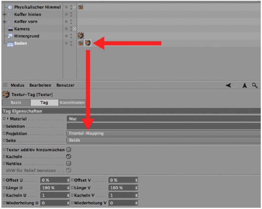 Manchmal möchte man ein Objekt oder eine Szene vor einem fotografierten Hintergrund verwenden. Und bitteschön mit Schatten! Damit Fotografie und Schatten eingefangen werden können, benötigen Sie zwei Objekte: Ein Bodenobjekt, auf dem die Szene steht, und ein Hintergrundobjekt, welches das fotografierte Bild tragen soll. Würde man nun mit derselben Auflösung rendern, die auch die Bilddatei besitzt, so sähe man zwar den korrekten Hintergrund und sogar den Schatten auf dem Boden, doch leider bliebe dieser grau. Damit er nahtlos in das Hintergrundobjekt übergehen kann, greifen Sie zu einem kleinen Kniff: Teilen Sie dem Boden dasselbe Bild zu wie dem Hintergrundobjekt, nur ändern Sie dessen Mappingart von »UVW« zu »Frontal«. Jetzt wird das Bild aus Sicht der Kamera auf den Boden projiziert, ohne dass ein Versatz zum Hintergrundobjekt entsteht.