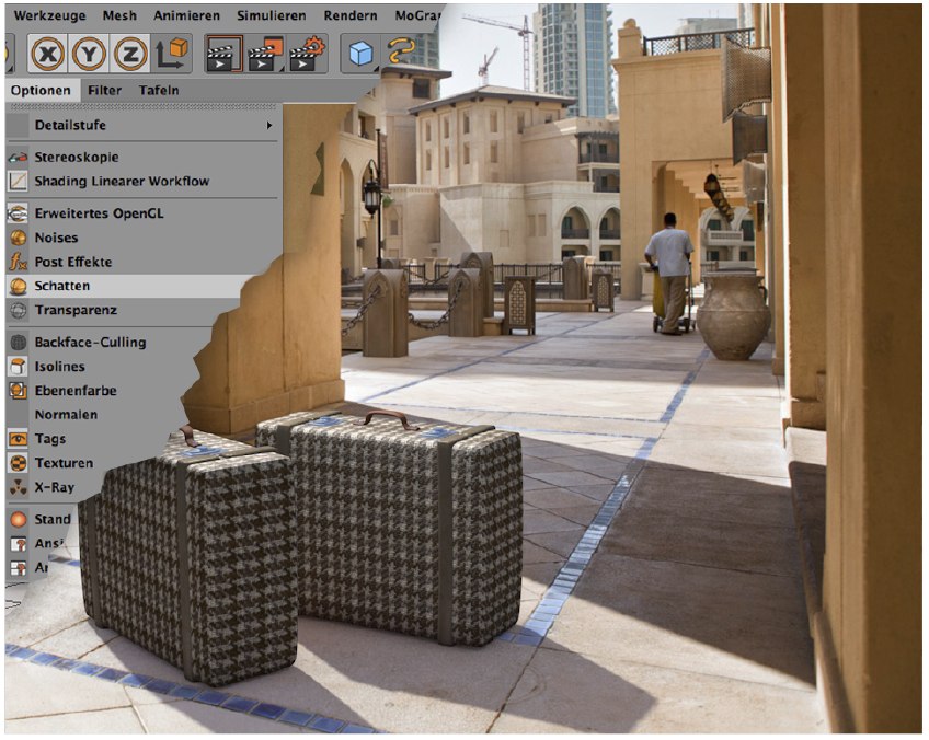 Jetzt kommt es eigentlich nur noch darauf an, die zur fotografierten Hintergrundszene passende Schattenfarbe und -position für die 3D-Objekte (im Beispielbild die Koffer) zu finden. Die Farbe können Sie im »Skymanager« einstellen, wenn Sie im linken Teil des Managers auf »Sonne« klicken. Etwas schwieriger gestaltet sich die Suche nach dem richtigen Sonnenstand. Damit Sie sich eine lange Testrender-Reihe ersparen können, nutzen Sie statt dessen lieber Ihre Grafikkarte besser aus: Im Menüpunkt »Optionen« des Editors klicken Sie auf »Erweitertes OpenGL«. Dann lassen sich auch die bis dahin hellgrauen Befehle anklicken, die sich direkt unter dem erweiterten OpenGL befinden. Wählen Sie nun den Schatten aus, bekommen Sie diesen im Editor zu sehen. Nun brauchen Sie lediglich den Himmel so zu drehen oder über die Angabe von Datum und Ort so zu positionieren, dass der Schattenwurf Ihrer 3D-Szene dem des fotografierten Hintergrundbildes entspricht.