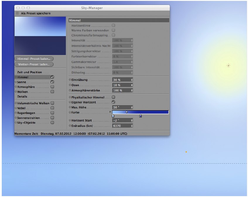 Wenn man sich mit Maus, Space Pilot oder Stift über die Menüleiste an den Punkt »Erzeugen« herantastet, poppt ein bescheiden wirkendes Menü auf. Darin liegt als Untermenü, mit einem hübschen kleinen Himmels-Icon geschmückt, eines der mächtigsten Tools des gesamten Programms: Der physikalische Himmel, quasi das Universum von Cinema4D. Doch obwohl sich nach dem Anklicken unverzüglich ein blaues Himmelszelt über die Szene spannt, ahnt man noch nicht, welche Möglichkeiten in diesem Werkzeug stecken. Denn neben dem reinen Beleuchten einer Szene lassen sich hier auch Wolkengebilde jeder Phantasiestufe anlegen, Wetterzustände und natürlich auch Stimmungen erzeugen, die von glutrotem Sonnenaufgang über eitel Sonnenschein bis Hochmoor-Nebel à la Edgar Wallace reichen – auch wenn dieses Moor nicht auf der Erde, sondern auf Planeten von Alpha Centauri liegen sollte.