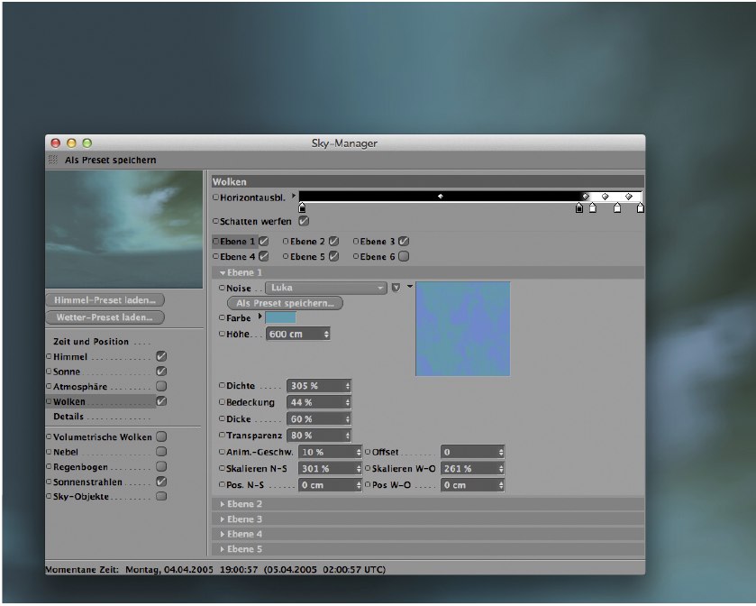 Cinema4D kennt zwei unterschiedliche Berechnungsarten von Wolken. Klicken Sie im oberen Teil der linken Menüleiste auf den Begriff »Wolken«. Damit erhalten Sie Zugriff auf bis zu sechs »Noise«-Ebenen, die Sie nach Belieben hinzuschalten können. Die perspektivische Wirkung der »Noise«-Ebenen und ihre Höhe lassen sie tatsächlich wie Wolken aussehen; dass sie völlig flach sind, fällt nicht ins Gewicht. Jede einzelne Wolkenschicht lässt sich separat von allen anderen in punkto Höhe, Noise-Art und -Farbe an die beabsichtigte Himmelsstimmung anpassen. Interessant ist die »Horizontausblendung« im oberen Teil des Fensters: Der Verlauf bestimmt, ab welcher Entfernung die Wolkenschicht ausgeblendet wird. So wird die Luftperspektive, also das natürliche Hellerwerden aller entfernten Gegenstände nachempfunden. Tipp: Wenn Sie nicht nur ein oder zwei Wolkenschichten aktiviert haben, sondern fünf oder gar sechs, sollten Sie den Grad der »Bedeckung« möglichst gering halten.