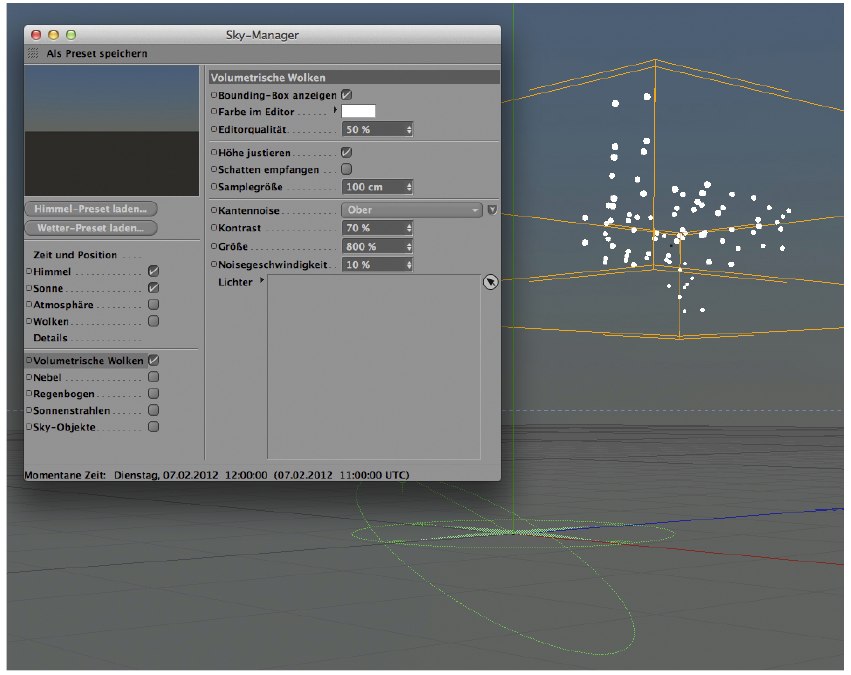 Auch dicke Wattewolken lassen sich erzeugen. Dazu gibt es im Untermenü des physikalischen Himmels das sogenannte »Wolkenwerkzeug«. Das Anlegen der Wolkengrundform erfolgt in zwei Schritten: Klicken Sie »Volumetrische Wolken« im »Skymanager« an, dann malen Sie mit dem »Wolkenwerkzeug« so etwas wie Kondensationskeime an den Himmel. Diese weißen Punkte werden perspektivisch aufgetragen – je näher Sie dem Horizont kommen, desto kleiner ist die Darstellung der verteilten Punkte. Drücken Sie als nächstes die »Shift-Taste«. Es erscheint eine Ebene innerhalb der Bounding Box, die ihre Position der Mausbewegung anpasst und stehen bleibt, sobald Sie zu malen beginnen. So lässt sich das Vervollständigen der Wolkenform sehr gezielt auf einzelne Bereiche beschränken. Tipp: Vermeiden Sie, mit dem Pinsel zu nahe an der orangenen Bounding Box zu malen, da Sie ansonsten rechteckige Wolkenformen bekommen.