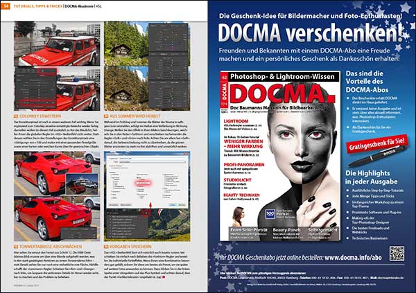 Mehr zu diesem Thema lesen sie in der aktuellen DOCMA-Ausgabe, die Sie im Zeitschriftenhandel bekommen und in unserem Webshop bestellen können. Wenn Sie sofort weiterlesen möchten, kaufen Sie sich im Webshop die PDF-Version des Heftes.