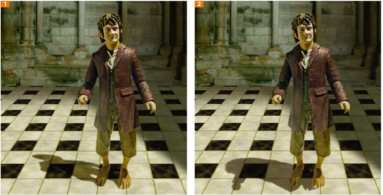 In den Bildern oben sehen Sie zweimal – fast – dieselbe Szene, doch mit einem wichtigen Unterschied: Der Schatten im einen Bild ist echt (wenn auch per Montage ergänzt) – der im anderen Bild ist ebenfalls einmontiert, aber falsch. Was meinen sie? Welcher ist korrekt, welcher nicht? Wenn ich in unserer Rubrik „Bildkritk“ – diesmal ab Seite 102 – auf Mängel bei der Schattenkonstruktion hingewiesen habe, wurde das gelegentlich mit den Worten abgetan: „Solche Fehler sieht doch sowieso niemand.“ Zugegeben, wenn der Unterschied eher gering ist, ist es in der Tat nicht ganz einfach, Richtiges und Falsches auseinanderzuhalten. Die Lösung: Bild 1 zeigt einen nicht korrekten, nur aus der Kontur der Figur abgeleiteten Schatten – Bild 2 den richtigen.