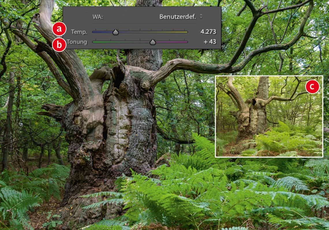 Ein automatischer Weißabgleich verschiebt die ­Grüntöne oft ins Gelbgrüne. Das wird von vielen als angenehm ­empfunden, sorgt aber gleichzeitig für schlechter differenzierte Grüntöne [3 c]. Der Weißabgleich ist dann das Hilfsmittel der Wahl. In Lightroom schieben Sie den Regler »Farbtemperatur« ein Stück in Richtung Blau [3 a]. Sowohl die Grün- als auch andere Farbtöne treten dann klarer in Erscheinung, so als hätten Sie einen gelblichen Schleier vom Bild entfernt. Im Wald aufgenommene Fotos sind oft grünstichig, denn das Licht wird durch das Blattgrün gefiltert. Auch dies können Sie über den Weißabgleich korrigieren. Verschieben Sie dazu den Regler für die »Tonung« in Richtung Magenta [3 b]. Schnell verschwindet der Grünstich und sowohl die Baumstämme als auch die Vegetation im Unterwuchs zeigen stimmigere Farben.