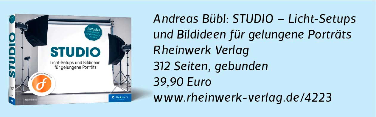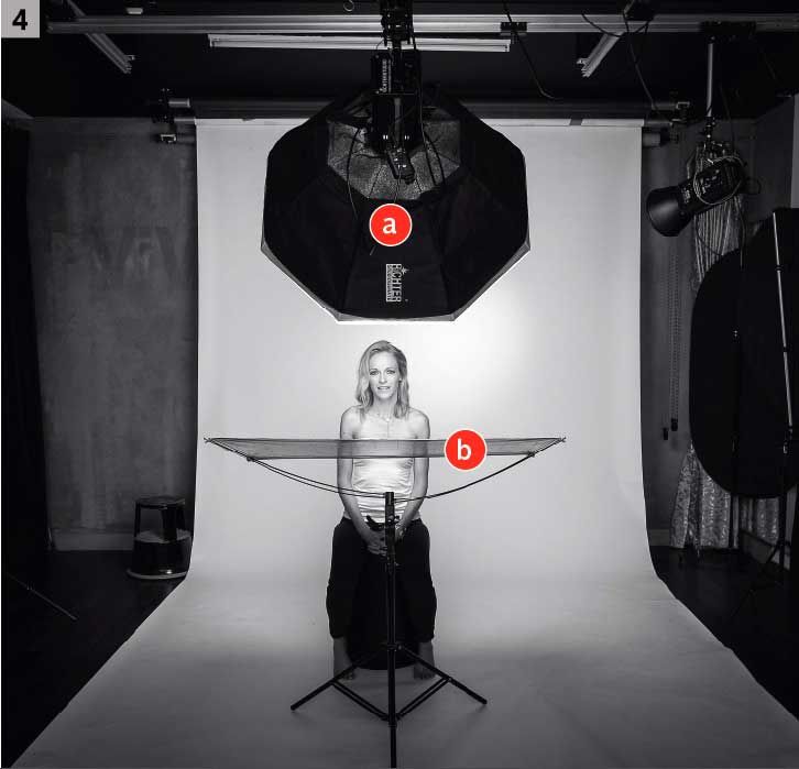 Ein klassisches Porträt-Setup ist das Hollywood-Licht, auch bekannt als „Butterfly-Licht“ wegen des „Schmetterlingsschattens“ unter der Nase. Bei der Standardvariante kommt entweder gar kein Aufheller zum Einsatz oder ein Reflektor direkt unter dem Gesicht des Models. Dieses Setup eignet sich für Close-ups und halbnahe Porträts [3]. Es betont vor allem die Augenpartie, die Wangenknochen und damit auch die Gesichtsform. Durch den Kontrast des Schattens unter den Augenlidern und die Aufhellung des unteren Teils der Augen strahlen diese ganz besonders. Der Halsschatten ist relativ breit und umrahmt mit den Haaren das Gesicht. Der Aufwand ist gering; Sie benötigen nur eine 80-Zentimeter-Octabox [4 a] und einen silbernen Reflektor der Größe 110 × 70 Zentimeter [4 b]. Durch den Reflektor werden die Schatten nicht zu dunkel und erzeugen ein zarteres Gesamtbild. Beim Licht-Setup gehen Sie so vor: