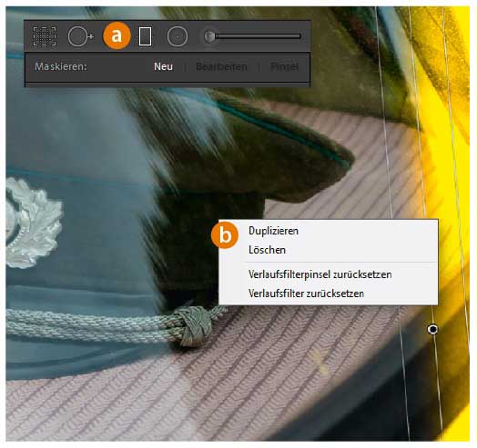 Lichtlecks sind meist annähernd rechteckig und laufen zu einer Seite weich aus; daher ist ein »Verlaufsfilter« (a) gut geeignet, diesen Effekt zu simulieren. Ziehen Sie zunächst einen »Verlaufsfilter« vom Bildrand her auf. Für ein natürliches, unregelmäßigeres Aussehen duplizieren Sie den Verlauf (b) und drehen die Kopie leicht. Wiederholen Sie diesen Vorgang gegebenenfalls.