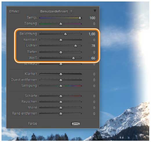 Lichtlecks entstehen durch direkten Lichteinfall auf das Filmmaterial, weshalb diese überbelichteten Stellen heller als der Rest des Bildes sind und unter Umständen einen gelblichen Farbton aufweisen. Die Überbelichtung lässt sich mit den Reglern »Belichtung« nachbilden und mit »Lichter« und/oder »Weiß« noch verfeinern.