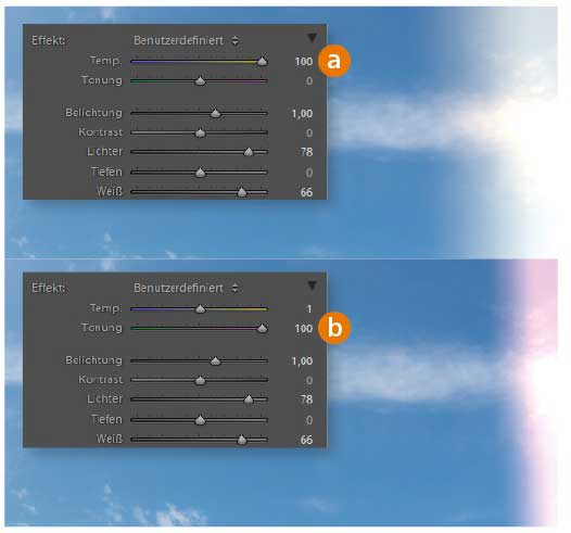Zur Einfärbung eines Lichtlecks gibt es mehrere Möglichkeiten. Über die Regler für den Weißabgleich, »Temperatur« (a) und »Tonung« (b), lässt sich der simulierte Lichteinfall farbig gestalten. Das Ergebnis hängt von den zuvor gewählten Helligkeitseinstellungen sowie auch vom Motiv und dessen Farbe ab.