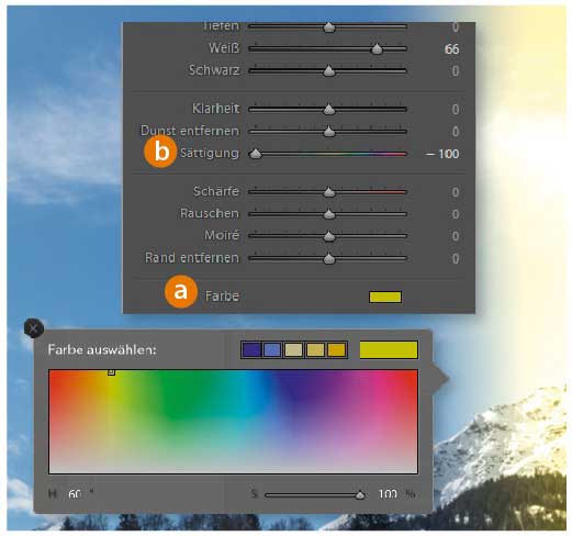 Über das Bedienfeld »Farbe« (a) lässt sich die Farbe des Lichtlecks in der Regel besser bestimmen. Allerdings ist das Ergebnis auch hier abhängig vom jeweiligen Untergrund. Reduzieren Sie zusätzlich die »Sättigung« (b), so verstärkt sich der Farbeffekt noch einmal.