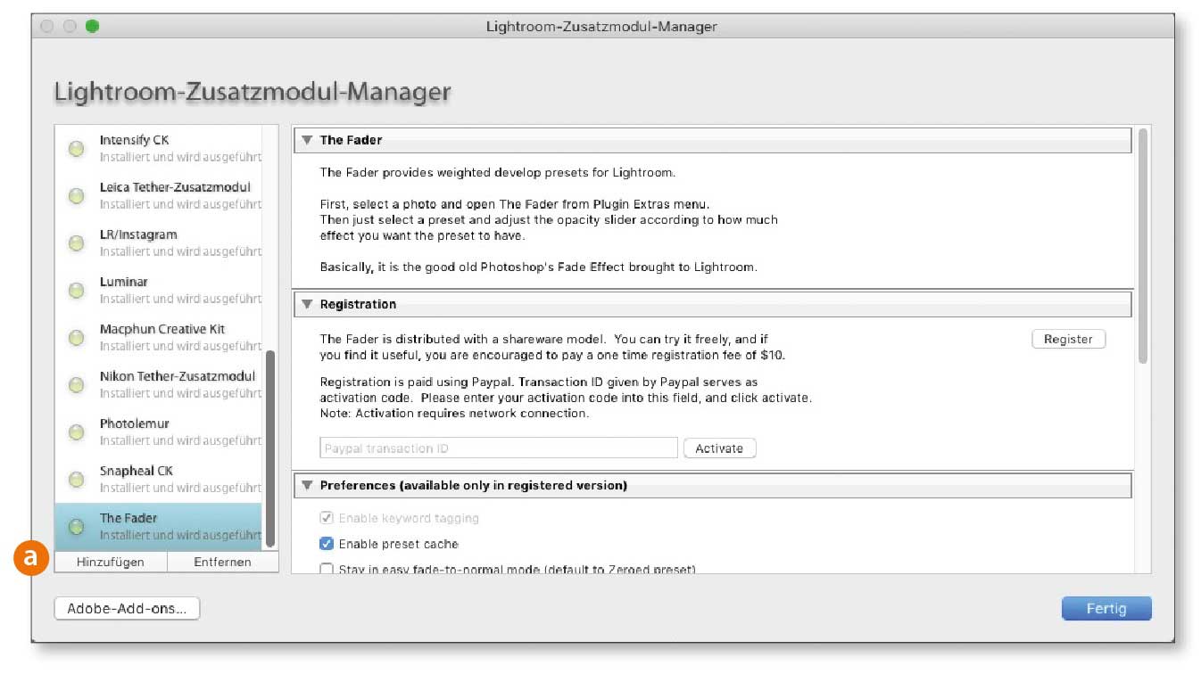 Öffnen Sie Lightroom und wählen Sie »Datei > Zusatzmodul-Manager«. Klicken Sie dort auf »Hinzufügen« (a) und wählen Sie im Folgedialog die heruntergeladene Datei „TheFader.lrplugin“ aus. Das war es auch schon.