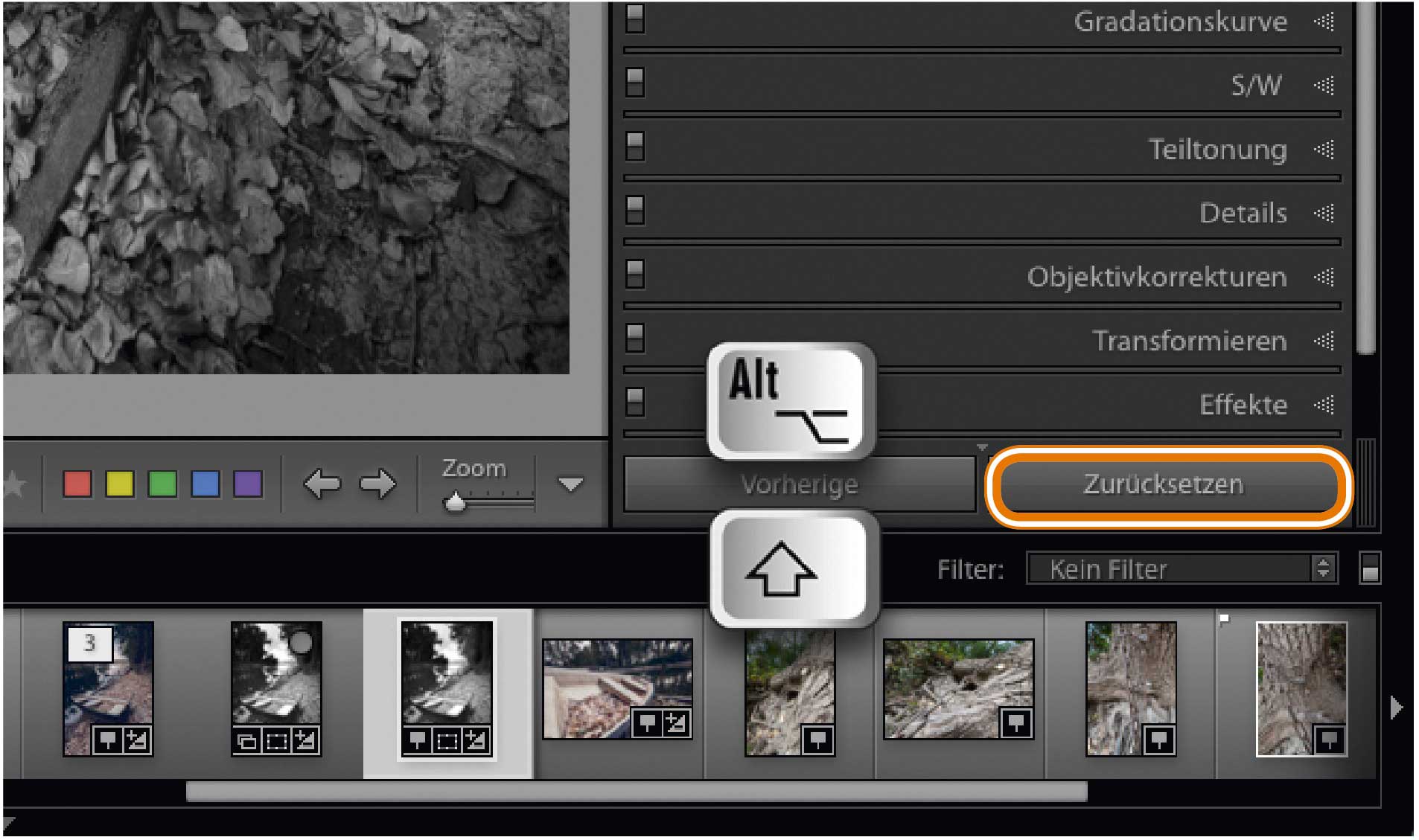 Um ein in Lightroom bearbeitetes Bild komplett auf den Ursprungszustand zurückzusetzen, genügt ein einziger Klick. Im »Entwickeln«-Modul finden Sie ganz unten rechts unter den Bearbeitungs-Bedienfeldern die Schaltfläche »Zurücksetzen«. Ein Klick entfernt alle vorgenommenen Änderungen. Sie brauchen aber keine Angst zu haben, irrtümlich diese Schaltfläche anzuklicken und dann alle Korrekturen zu verlieren, denn auch dieser Schritt wird in der »Protokoll«-Palette registriert. Sie können das Zurücksetzen also problemlos rückgängig machen.