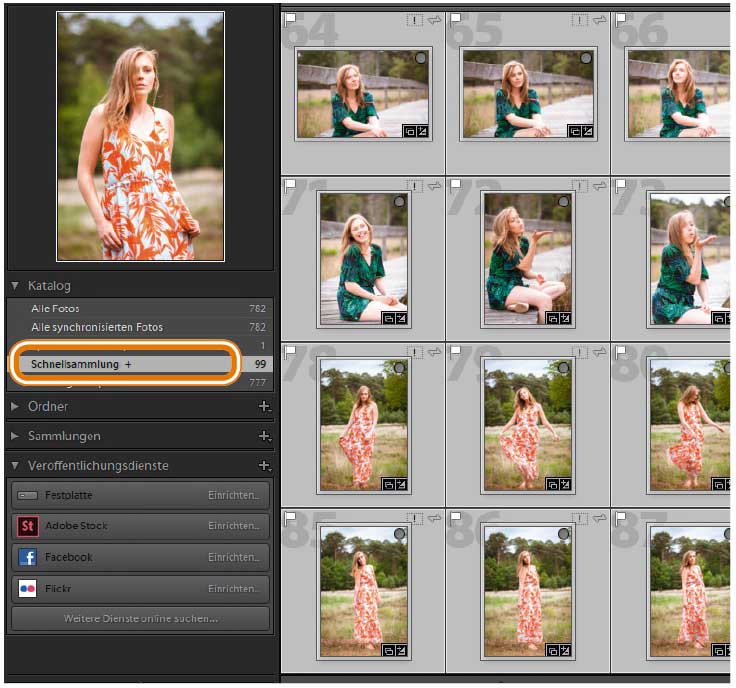 Eine Übersicht über die so gesammelten Bilder erhalten Sie im Modul »Bibliothek«, wenn Sie unter »Katalog« den Eintrag »Schnellsammlung« anklicken. In dieser Ansicht lassen sich die Fotos auch wieder aus der Sammlung entfernen oder Bilder neu arrangieren, indem Sie sie mit gedrückter Maustaste an einen neuen Ort verschieben.