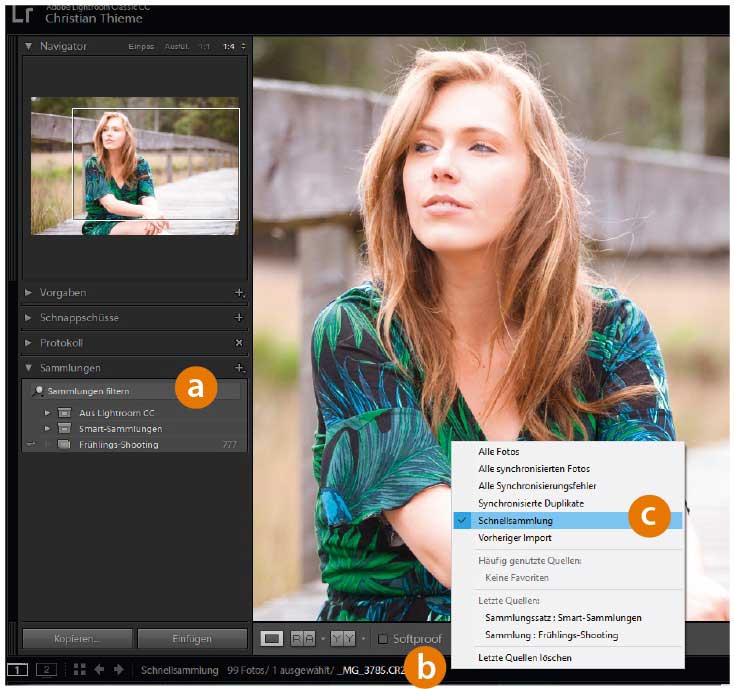 In den weiteren Modulen von Lightroom CC Classic erscheint die »Schnellsammlung« leider nicht als eigener Menüpunkt im Bereich »Sammlungen« (a). Um die »Schnellsammlung« nachträglich aufzurufen, ist ein Rechtsklick auf die Titelleiste des Filmstreifens (b) nötig. Im Kontextmenü wählen Sie dann die »Schnellsammlung« (c) aus.