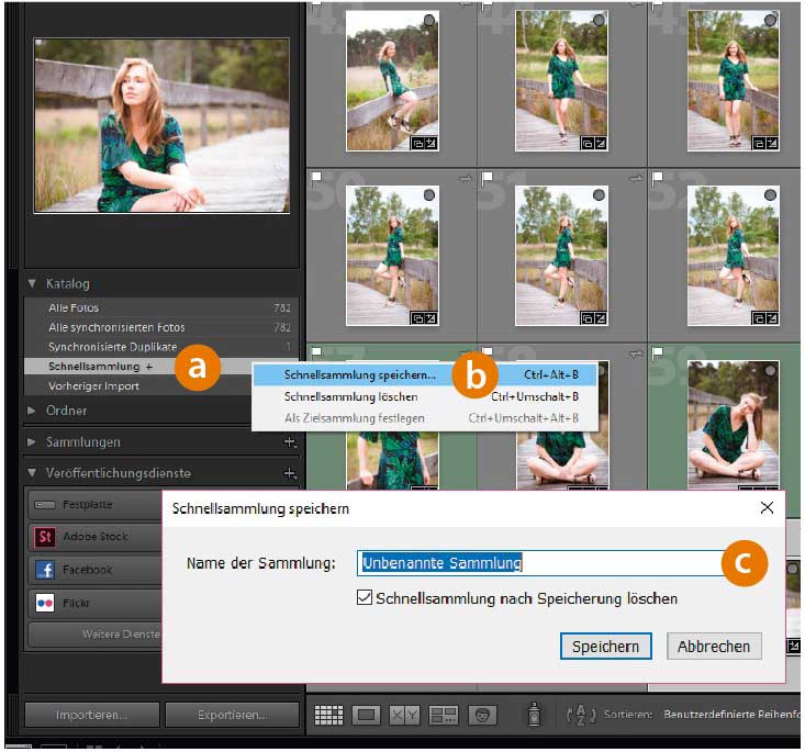 In der »Bibliothek« können Sie mit einem Rechtsklick auf »Schnellsammlung« (a) ein Menü aufrufen. Hier haben Sie die Möglichkeit, die »Schnellsammlung« in eine reguläre »Sammlung« zu überführen (b). Schneller geht es mit dem Shortcut »Strg/Cmd-Alt-B«. Im erscheinenden Dialog (c) geben Sie der Sammlung einen Namen und speichern Ihre Arbeit.