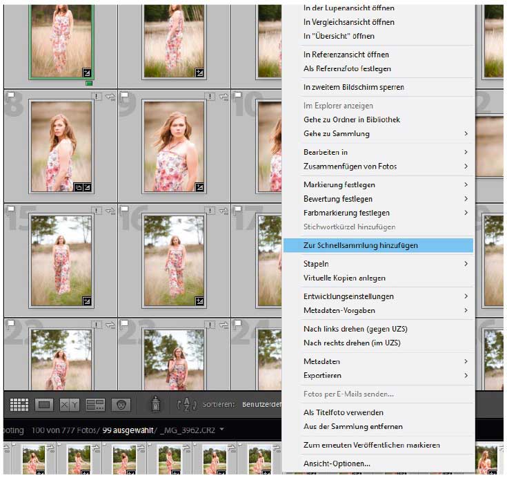 Haben Sie einen Ordner in der »Bibliothek« ausgewählt, können Sie mehrere Bilder mit »Strg/Cmd« und einem Mausklick auswählen. Über das Kontextmenü oder – noch schneller – mit der Taste »B« können Sie Bilder »Zur Schnellsammlung hinzufügen«. Wiederholen Sie diesen Vorgang, bis Sie der »Schnellsammlung« alle gewünschten Bilder hinzugefügt haben.