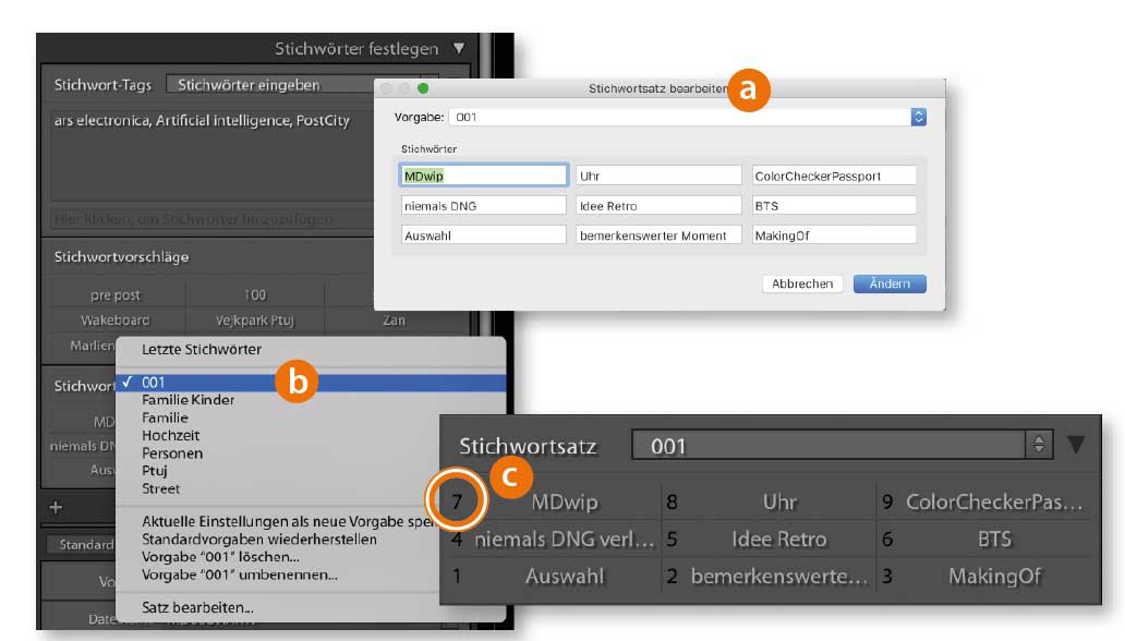 Mit dem Stichwortsatz ist es möglich, häufig benötigte Stichwörter zu definieren (a), den jeweils relevanten Satz auszuwählen (b) und dann schnell auf Bilder anzuwenden. Das beste Feature am Stichwortsatz verbirgt sich hinter der »Alt«-Taste. Wenn Sie diese gedrückt halten, werden Ziffern vor den Stichwörtern aufgelistet (c). Durch Drücken der entsprechenden Zifferntasten wenden Sie die Stichwörter auf die gerade ausgewählten Fotos an.