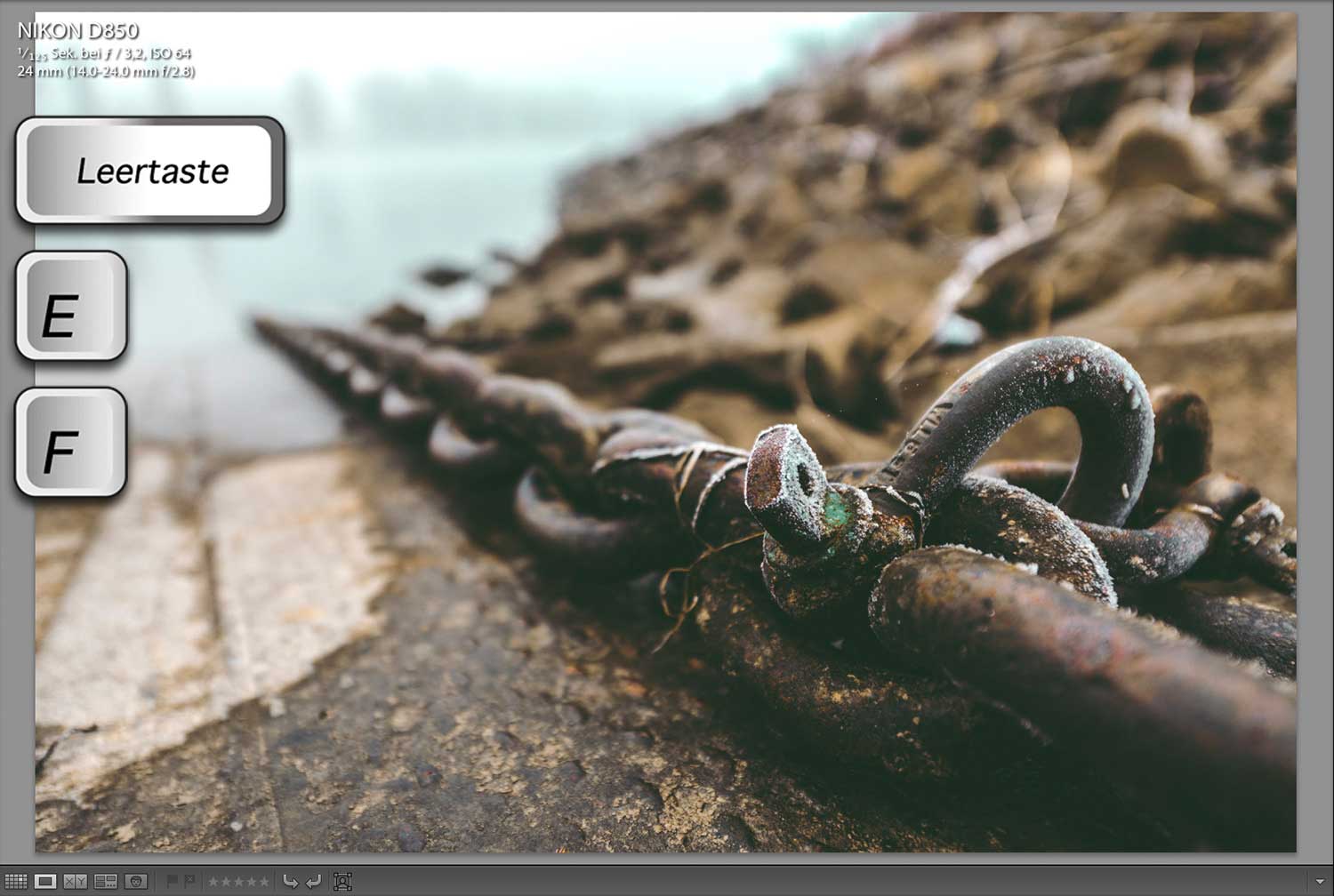 TIPP: Mit der Taste »F« aktivieren beziehungsweise verlassen Sie den Vollbildmodus, in dem das Foto vor schwarzem Hintergrund auf Bildschirmgröße gezoomt angezeigt wird. Mit der »Leertaste« lässt sich auch hier zwischen der 1:1- und der eingepassten Bilddarstellung wechseln.