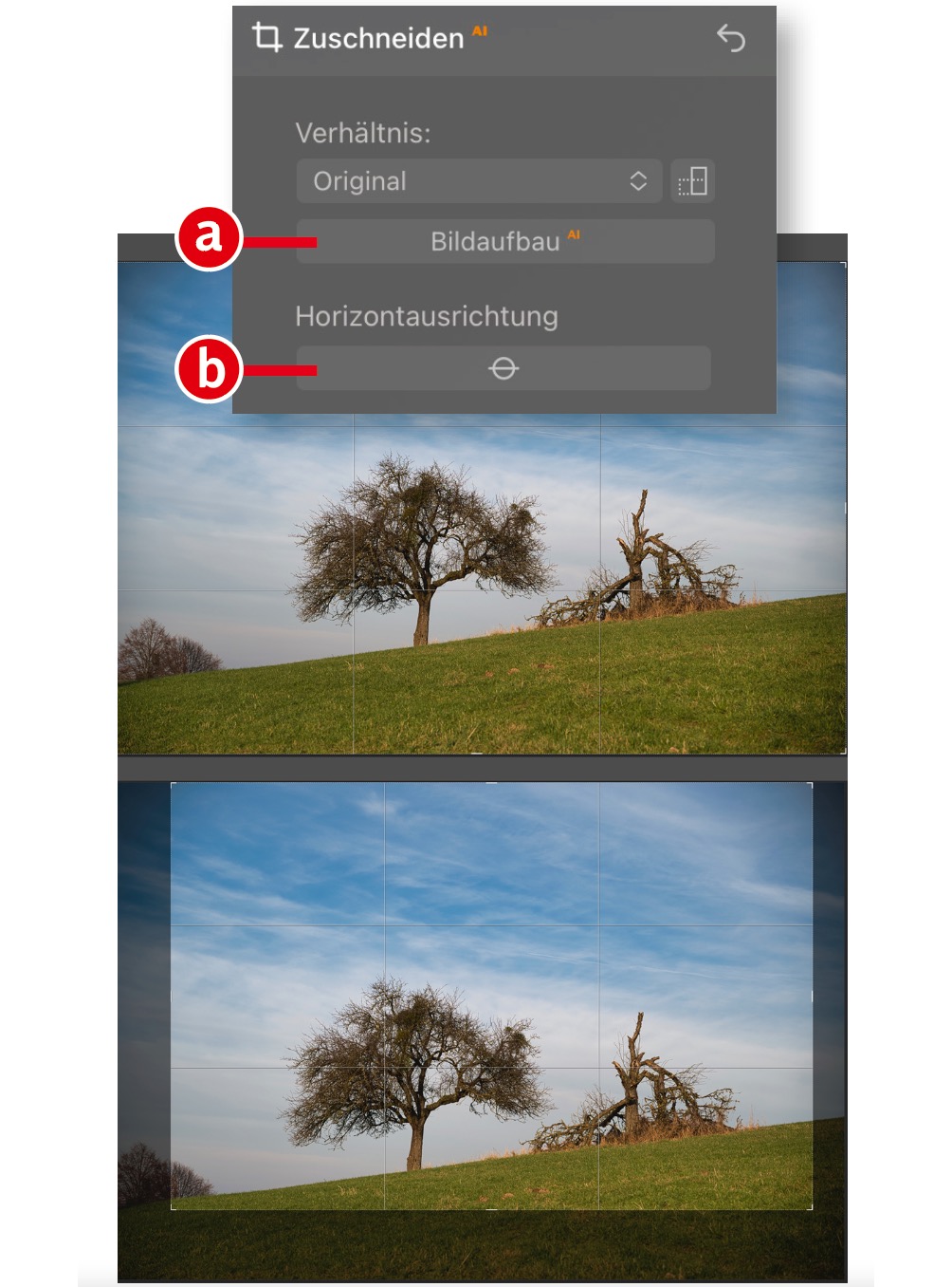 Luminar Neo kann beim Ermitteln eines interessanten Bildschnitts helfen. Nach einem Klick auf die Schaltfläche »Bildaufbau«(a) beim »Zuschneiden«-Werkzeug schlägt Luminar Neo einen Bildzuschnitt vor, der nach den Maßstäben der zugrunde liegenden künstlichen Intelligenz optimal ist. Auch wenn das nach menschlichen Maßstäben nicht immer der Fall ist, erhalten Sie mit nur einem Klick eine Bildvariante, die vielleicht dabei hilft, Ihren originalen Zuschnitt noch einmal zu überdenken. Die »Horizontausrichtung« (b) rückt ein Bild ­automatisch gerade.
