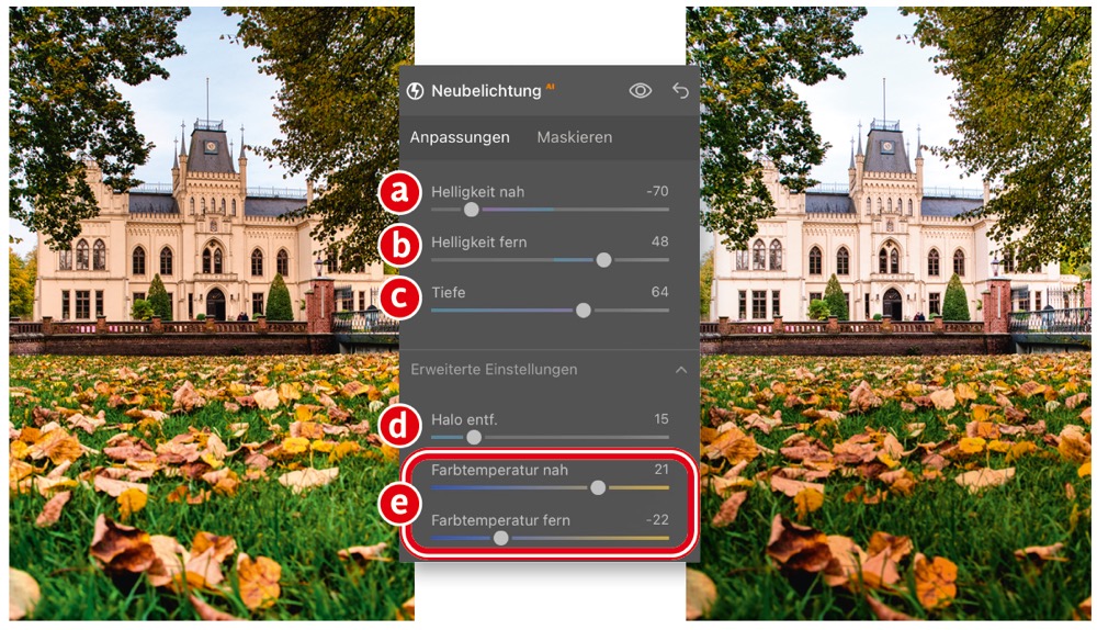 Die Funktion »Neubelichtung« in Luminar Neo erzeugt mithilfe künstlicher Intelligenz eine Tiefenkarte des Bildes und erlaubt das Einstellen der Helligkeit – getrennt für den Vorder- und Hintergrund. Für mehr Bildtiefe ziehen Sie »Helligkeit nah« (a) etwas nach links, um den Vordergrund etwas abzudunkeln und »Helligkeit fern« (b), um den Hintergrund aufzuhellen. »Tiefe« (c) legt den Übergangsbereich zwischen beiden fest. Etwaige Helligkeitssäume reduzieren Sie mit »Halo entfernen« (d). Die Tiefenwirkung eines Bildes verstärken Sie zusätzlich durch eine warme Farbtemperatur in der Nähe und eine kühlere in der Ferne (e).