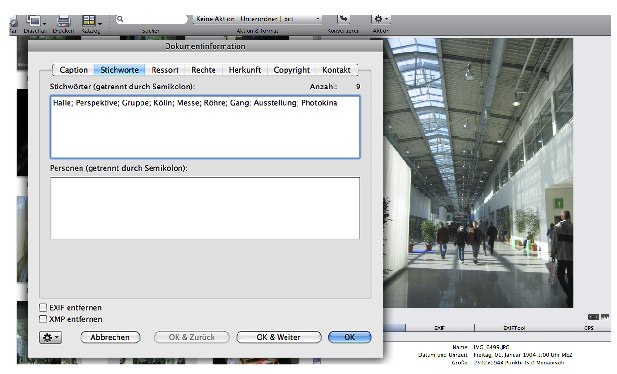 Mit »Befehl-I« erreichen Sie den Dialog, mit dem sich die IPTC-Daten für ein geöffnetes Bild eingeben und bearbeiten lassen. Ist ein Browserfenster des Programms aktiv, gelten die Eingaben für alle ausgewählten Bilder. Neu im IPTC-Diaolg von GraphicConverter 7.6.2 sind der Reiter »Kontakt« für die Kontaktdaten des Fotografen und die Zählfunktion für die bereits eingegebenen Stichwörter, da manche Bildagenturen fordern, dass für jedes Bild mindestens 40 Stichwörter vergeben werden müssen. Wer seinen Bildern schnell vordefinierte Stichwörter zuweisen will, wählt aus dem Fenster-Menü die Palette »Stichwörter«.