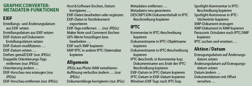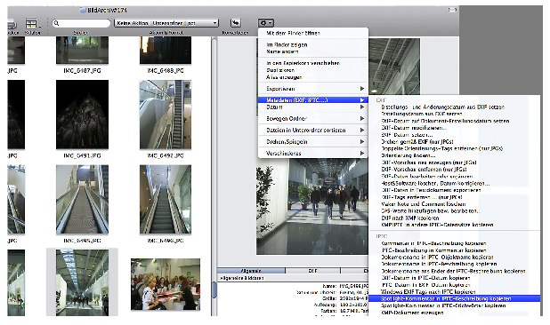 Einzigartig in GraphicConverter sind Funktionen wie die zum Kopieren von Finder- bzw. Spotlight-Kommentar, Dokumentname oder EXIF-Datum in verschiedene IPTC-Felder. Diese Funktionen erweisen sich als Retter in der Not, wenn Sie einen Bildbestand zur Bearbeitung erhalten, der die Beschreibung im Dokumentnamen oder die Stichwörter im Spotlight-Kommentar enthält. Klicken Sie in der Symbolleiste des Browsers auf das Icon »Aktion« und wählen Sie unter Metadaten (EXIF, IPTC …) eine Funktion wie beispielsweise »Spotlight-Kommentar in IPTC-Stichwörter kopieren« oder »EXIF-Datum in IPTC-Datum kopieren«.