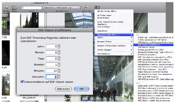 Wenn die Uhr in der Kamera bei einer Reise oder nach der Umstellung auf die Sommerzeit falsch eingestellt war, können Sie mit GraphicConverter das EXIF-Datum korrigieren. Ermitteln Sie, um wie viele Stunden und ggfs . Tage das Datum korrigiert werden muss. Wählen Sie aus dem Metadaten-Submenü [Bild?2] »EXIF-Datum modifizieren« und geben Sie die entsprechenden Werte ein; negative Werte werden abgezogen. Professionelle Fotografen, die viel reisen, stellen in ihren Kameras meist UTC (Codierte Weltzeit) ein. Wer die Ortszeit eines solchen Fotos ermitteln will, muss den Aufnahmeort kennen und die Differenz berechnen.