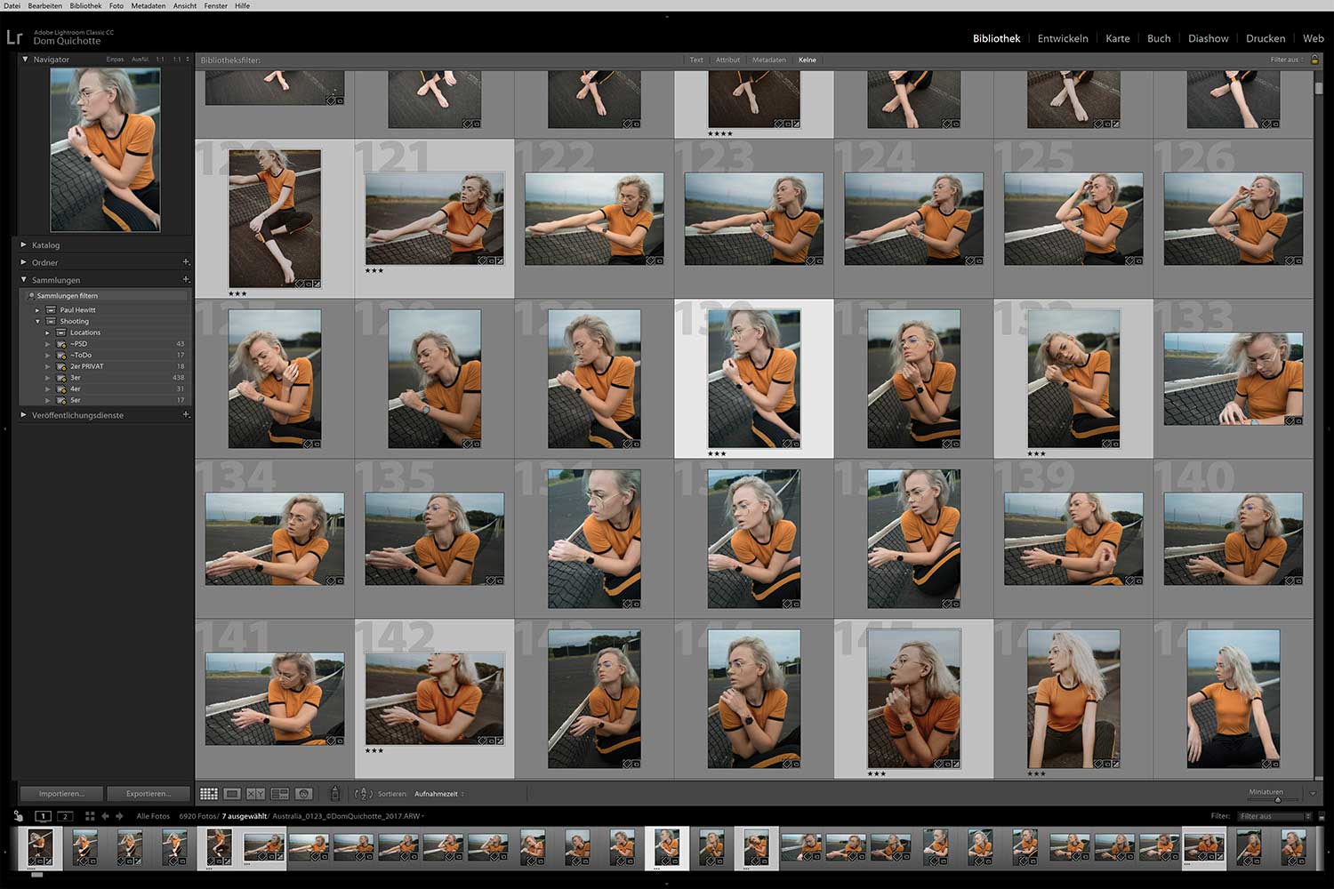 Nach dem Import der Bilder in Lightroom versehe ich sie mit Metadaten und benenne sie um. Anschließend erfolgt der zeitaufwendigste Schritt – das Auswählen der Bilder. Dafür nutze ich zunächst die Rasteransicht. Hier kann ich mit meinen Fingergesten die Größe der Miniaturbilder steuern und je nach Bedarf rein oder raus zoomen. Eine Auswahl mehrerer Bilder erfolgt mit gedrückter »Strg«-Taste und Tippen auf das entsprechende Bild. Verglichen mit der Maussteuerung bin ich so um einiges schneller.