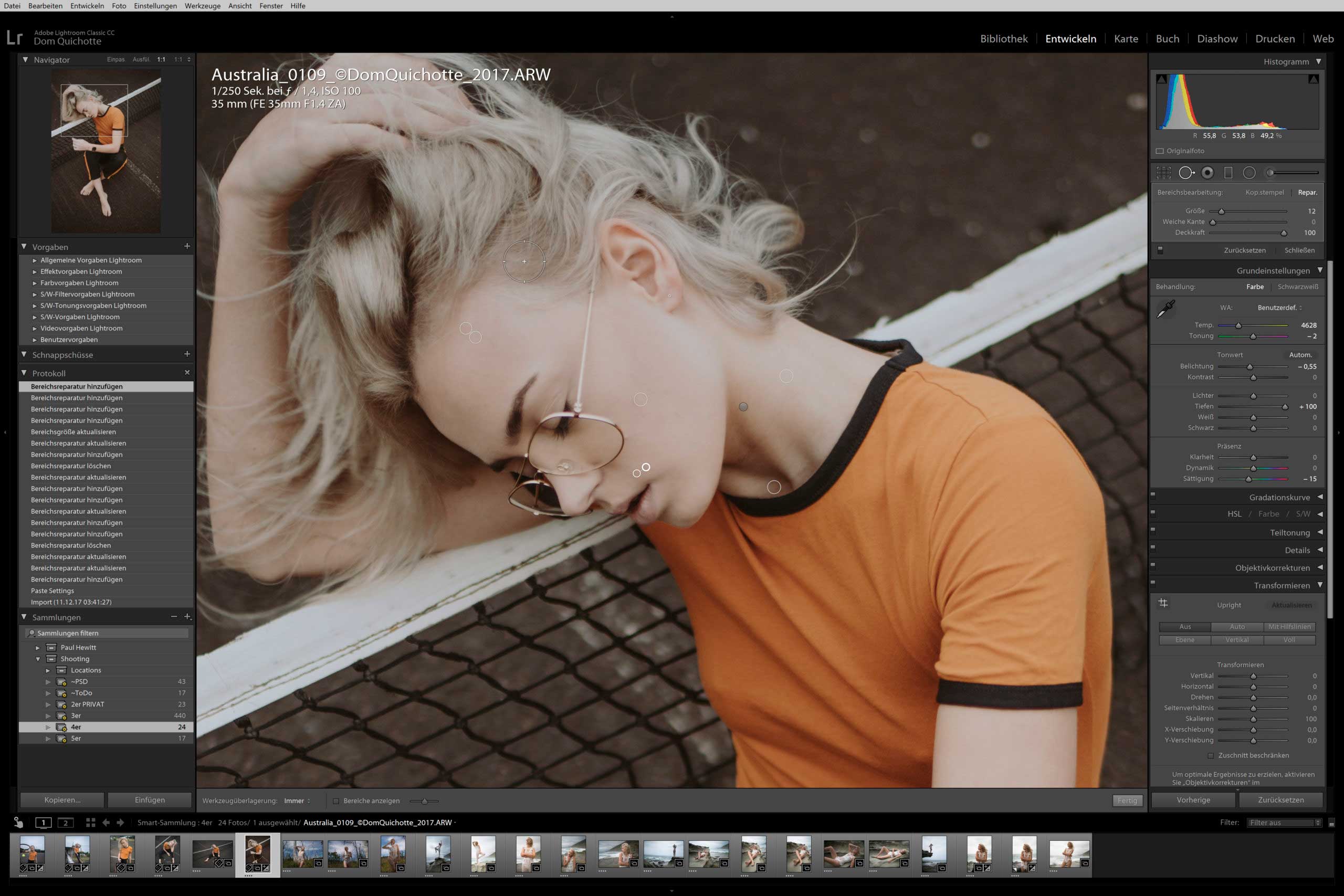 Die meisten Bilder bearbeite ich in Photoshop, aber das ist nicht immer erforderlich. Viele Bearbeitungsschritte lassen sich ebenso gut in Lightroom erledigen. Selbst kleinere Retuschen wie beispielsweise das Entfernen von Sensorflecken sind mit dessen Mitteln problemlos möglich. Hierzu habe ich die verschiedenen Aktionen des Dial mit den dafür am häufigsten verwendeten Tastenkürzeln belegt. Nun kann ich durch Drücken des Dials den »Reparaturpinsel« öffnen und durch Drehen die Größe des Pinsels bestimmen.