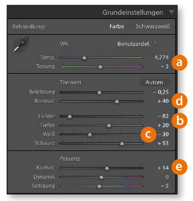 Auch bei diesem Style holen Sie danach mit den Reglern »Tiefen« und »Lichter« (b) wieder etwas mehr Struktur aus den „abgesoffenen“ beziehungsweise „ausgefressenen“ Bereichen zurück – allerdings im dunklen Bereich nicht so sehr wie bei dem „Fresh“-Look. »Schwarz« wird auch hier sehr weit aufgehellt. Der »Weiß«-Regler (c) wird in diesem Fall jedoch nicht zum Anheben des Lichterkontrasts benutzt, sondern für die genau gegenteilige Wirkung. Sie wollen ja ein „Moody“-Ergebnis bekommen. Starke globale Kontraste erhalten Sie durch den Regler »Kontrast« (d), und über »Klarheit« (e) erhöhen Sie den Mitteltonkontrast. Das ist schon die halbe Miete.