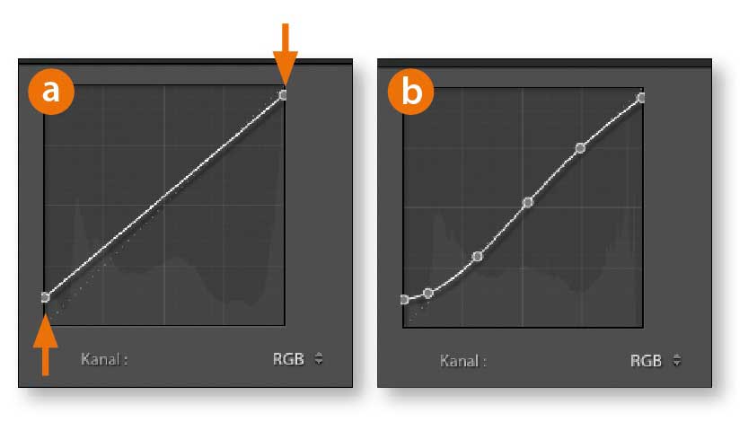 In den Kanälen Rot, Grün und Blau verstärken Sie wie beim „Fresh-Style“ durch eine S-Kurve den Kontrast. In der RGB-Kurve gehen Sie jedoch etwas anders vor: Um das Bild für den Moody-Look (das englische „moody“ bedeutet soviel wie launisch/mürrisch/verstimmt) noch matter erscheinen zu lassen, verschieben Sie die beiden Endpunkte der Kurve vertikal in Richtung Mitte (a). So erhalten Sie einen matten Look, den Sie durch weitere Anfasser auf der Kurve fein abstimmen können. Erzeugen Sie hierbei eine leichte S-Form nahe der diagonalen Linie (b).