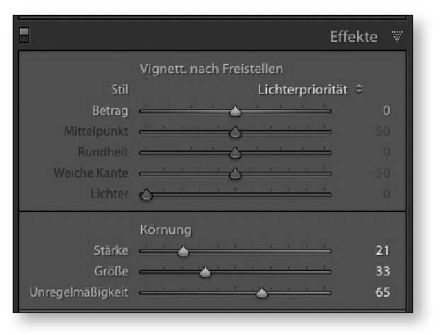 Wählen Sie beispielsweise folgende Parameter: »Stärke: 21«, »Größe: 33«, »Unregelmäßigkeit: 65«. Bei vielen Fotos würde zudem eine abdunkelnde Vignette nicht schaden –
